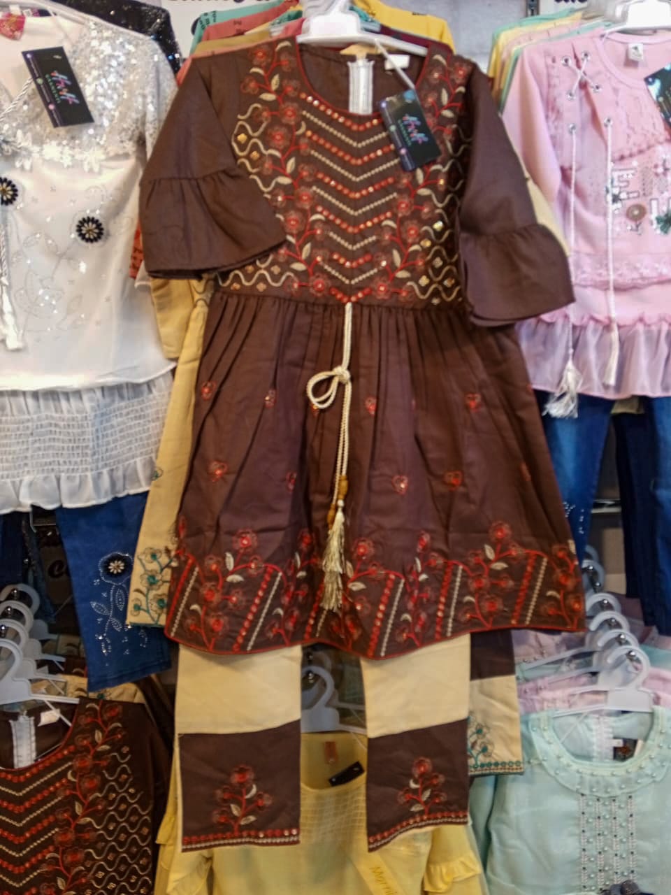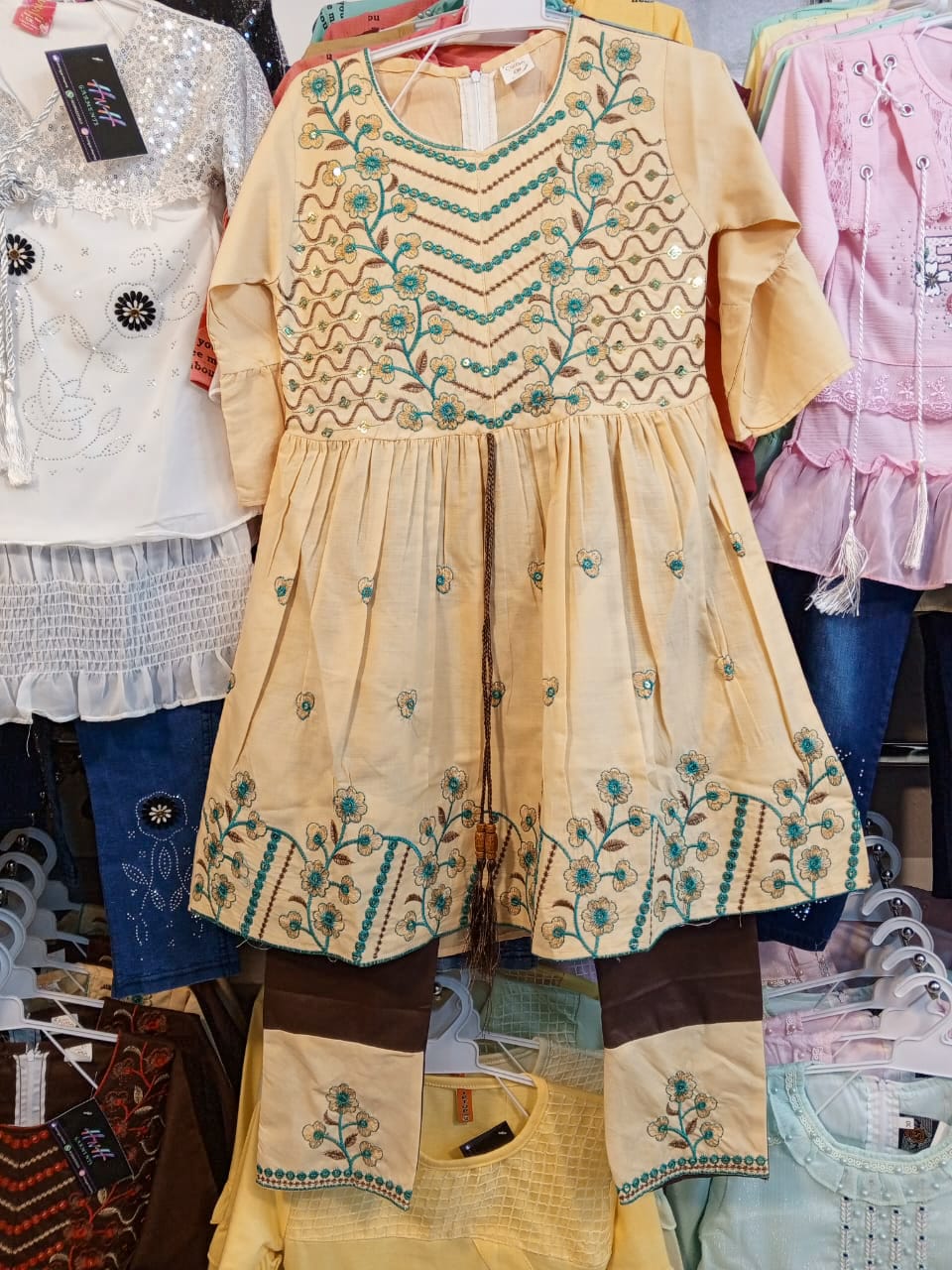 – Embroidery: Contrast thread on frock